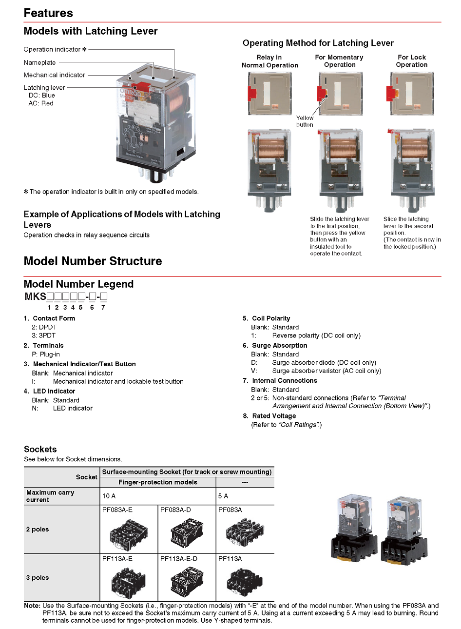 Rơ le trung gian Omron dòng MK-S thuộc loại rơ le công suất thông dụng, có đèn báo chỉ thị cơ khí và nút bấm thử có thể khóa.
